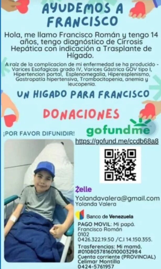 Llama poderosamente la atención cómo el caso del joven Francisco Román, de 14 años, residente del pueblo de Carache, Estado Trujillo, ha invadido las redes sociales, llamando la atención de importantes generadores de contenido a nivel nacional e internacional. No podemos ignorar la lamentable condición de salud de este joven, que a sus 14 años cuenta con un récord de resistencia física admirable. Sus deseos de vivir y de superar su condición congénita son únicos. Sus padres, Francisco y Celimar, han dedicado gran parte de su vida a atender a su primogénito con los cuidados y requerimientos necesarios que le han permitido sobrellevar su enfermedad y convivir con ella sin perder la esperanza de lograr el tan ansiado milagro: «UN HÍGADO NUEVO PARA FRANCISCO».