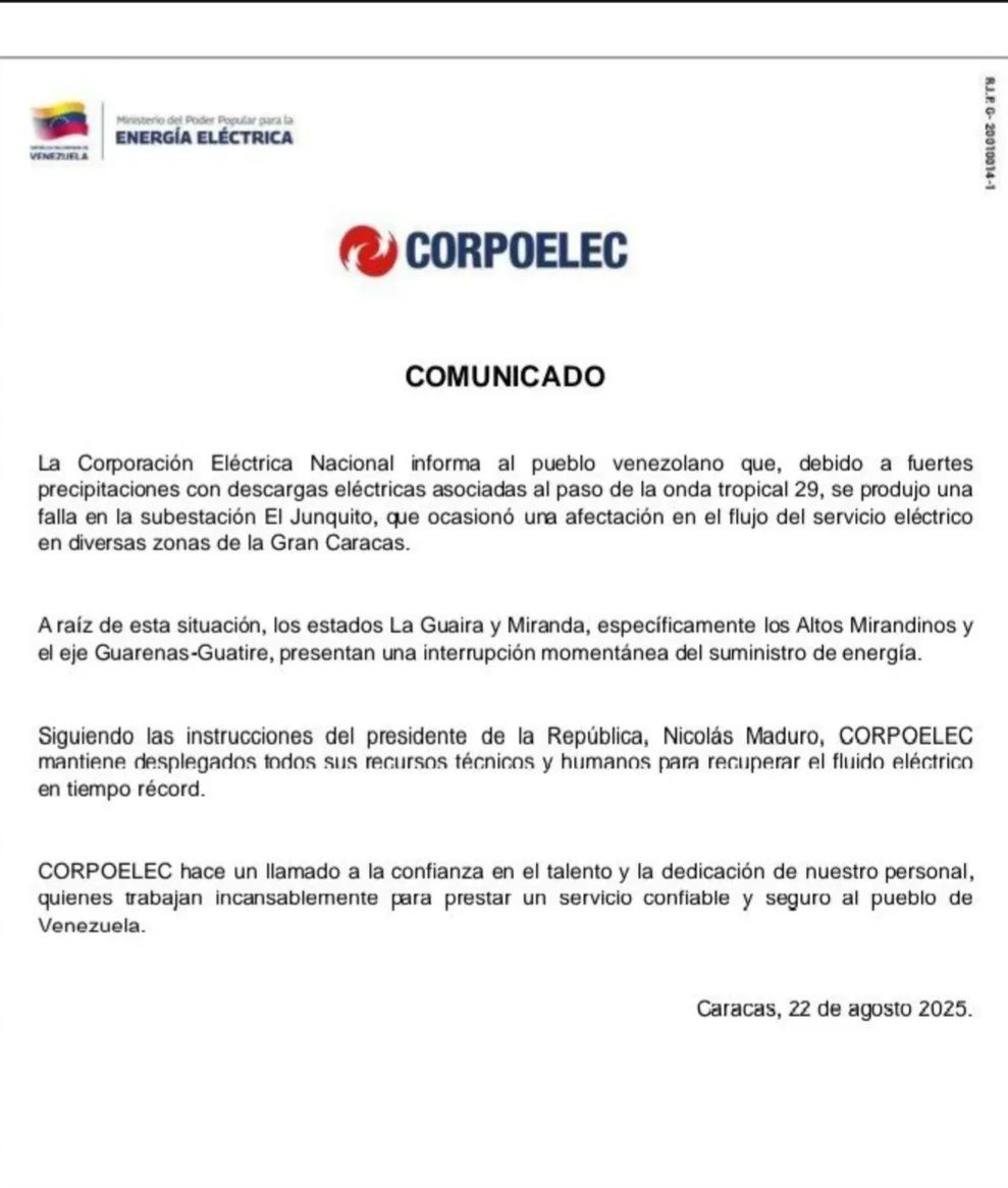En el comunicado, la estatal eléctrica mencionó que el apagón fue consecuencia de las «precipitaciones con descargas eléctricas asociadas al paso de la onda tropical 29», lo que provocó una falla en la subestación El Junquito. Dicha falla interrumpió el fluido eléctrico en zonas de la Gran Caracas, afectando también los estados La Guaira y Miranda.