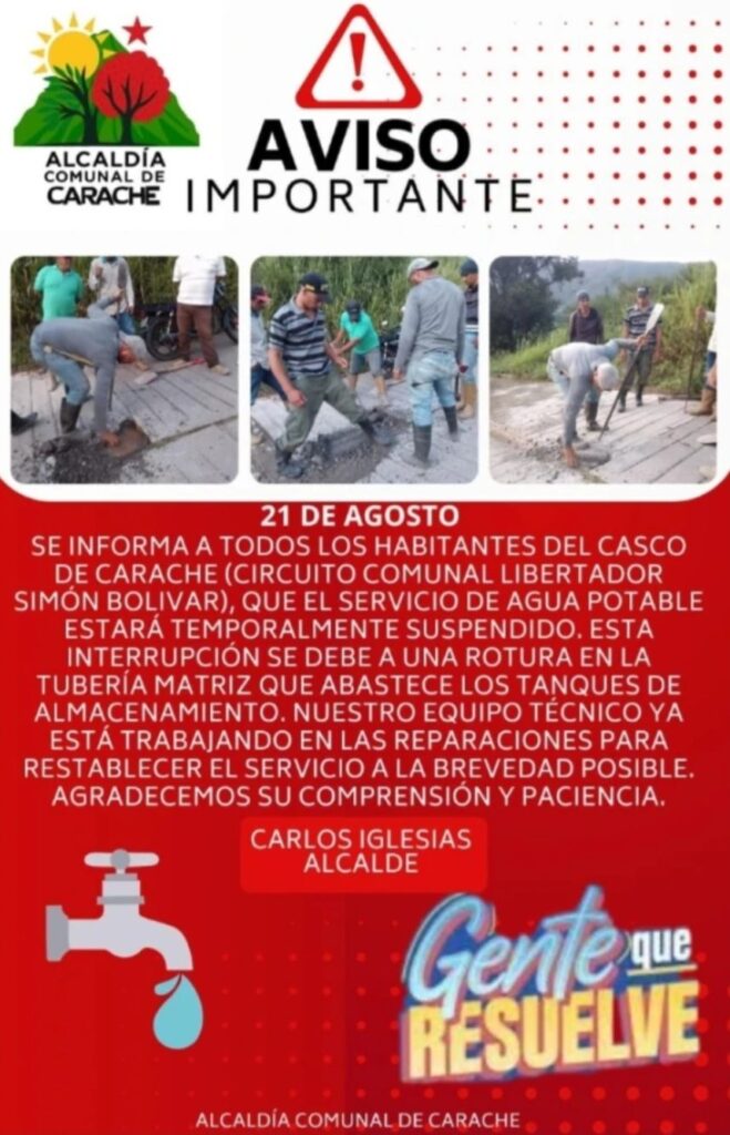 La Alcaldía Comunal de Carache informó a la ciudadanía en horas de la noche, a través de un video y un comunicado, que el problema se debía a la «rotura de la tubería matriz que abastece los tanques de almacenamiento». Por esta razón, el servicio de agua potable fue suspendido hasta que la situación sea solventada.