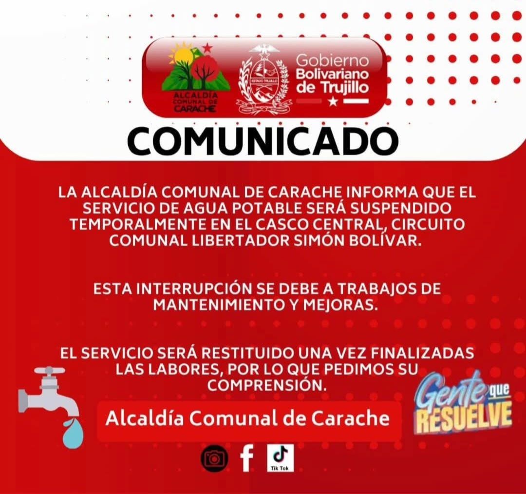 LA ALCALDÍA COMUNAL DE CARACHE INFORMA QUE EL SERVICIO DE AGUA POTABLE SERÁ SUSPENDIDO TEMPORALMENTE EN EL CASCO CENTRAL, CIRCUITO COMUNAL LIBERTADOR SIMÓN BOLÍVAR.