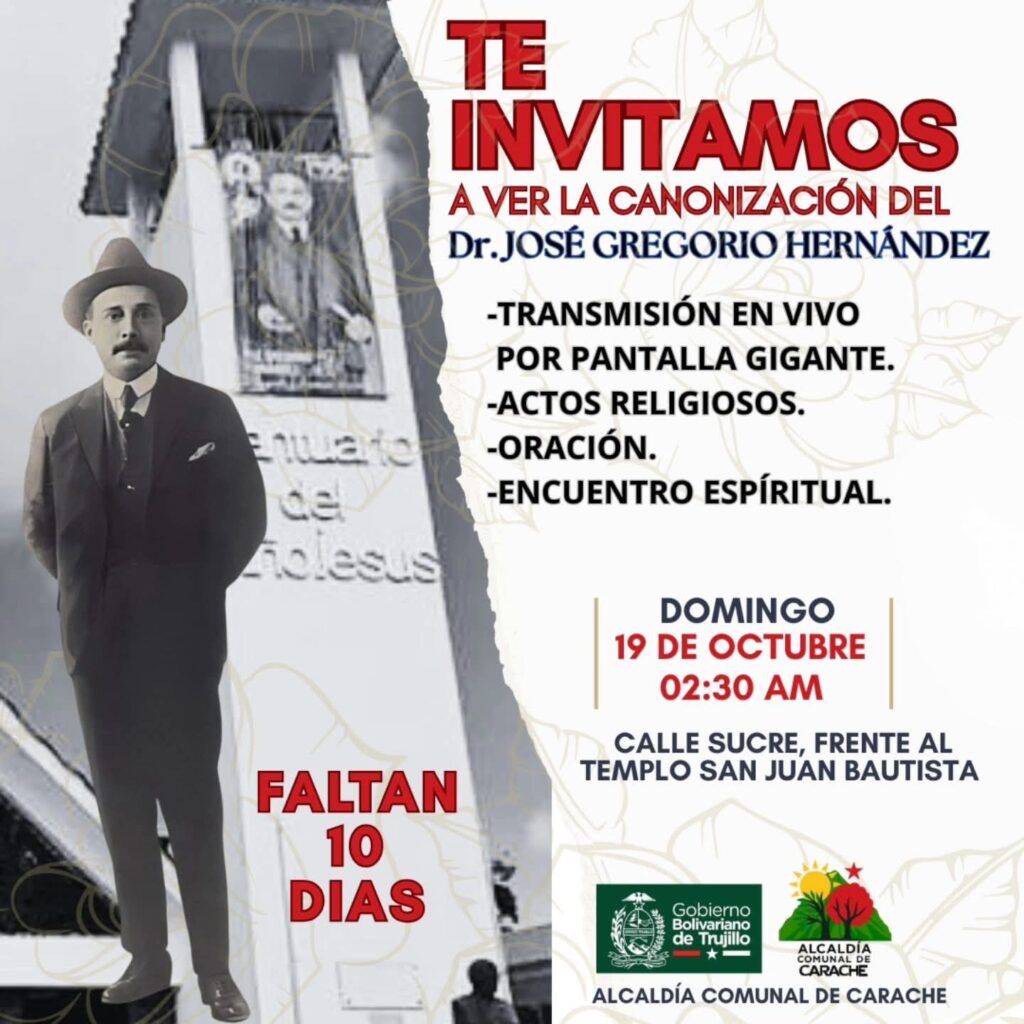 La Alcaldía Comunal de Carache anunció la noche de este jueves 9 de octubre, a través de sus redes sociales, que  instalara una pantalla gigante para la proyección en vivo de la ceremonia de Canonización de los beatos venezolanos, el Dr. José Gregorio Hernández y la Madre Carmen Rendiles.