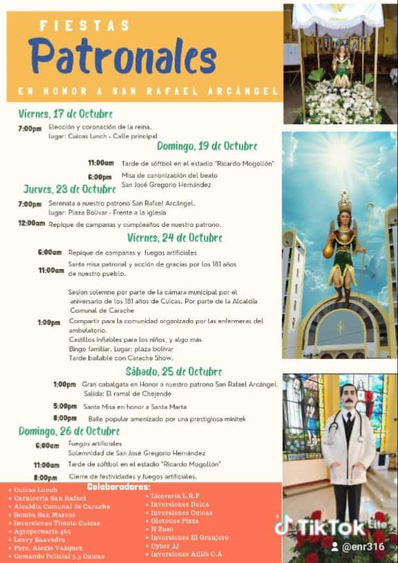 La importante población de Cuicas, en el municipio Carache, ya se encuentra preparada y lista para celebrar sus «Fiestas Patronales en Honor a San Rafael Arcángel». El Comité Organizador de estas festividades se puso en contacto con este medio digital para hacer pública la extensa programación que tienen preparada para los locales y visitantes que deseen disfrutar de estos días.