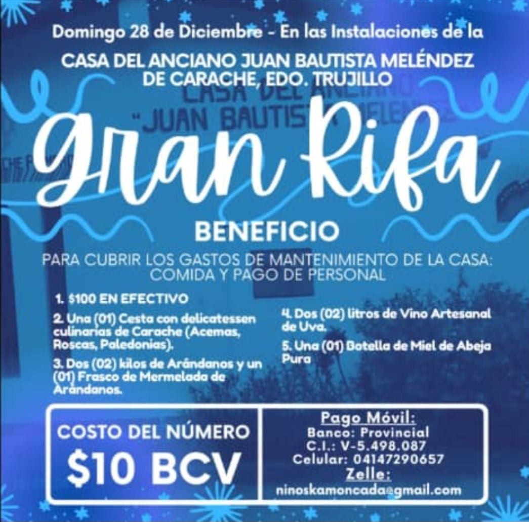 La directiva y el personal de la Casa del Anciano Juan Bautista Meléndez de Carache, Estado Trujillo, han anunciado la realización de una «Gran Rifa» solidaria para asegurar la continuidad operativa de este importante centro asistencial.