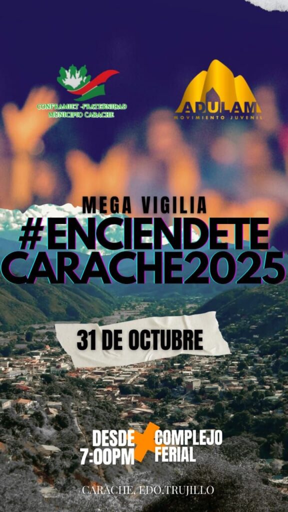 La Fraternidad Cristiana del municipio Carache y el Movimiento Juvenil ADULAM tienen preparado para este viernes 31 de octubre una importante actividad de oración y alabanza: la «Mega Vigilia Enciende Carache». Un evento que se realizará en los espacios del Complejo Ferial de Carache y estará abierto a todas las personas que deseen participar y unirse.