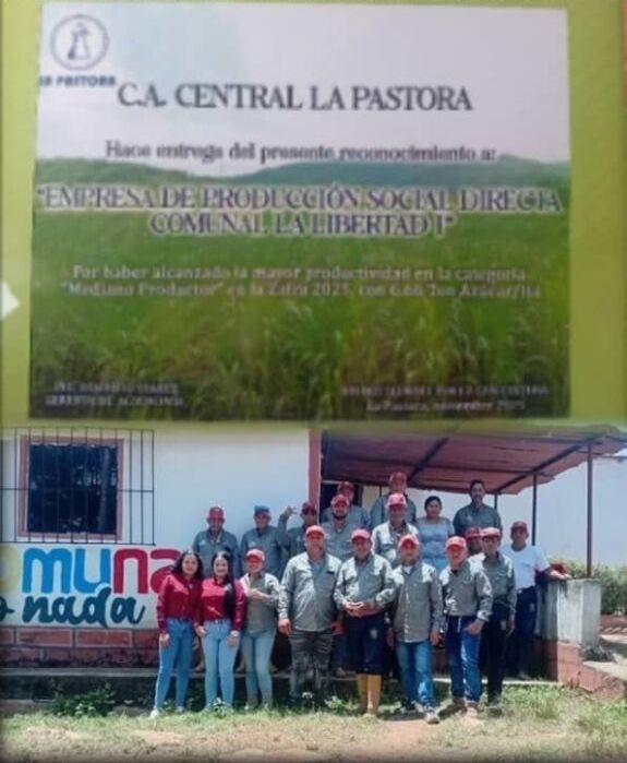 La Empresa de Propiedad Social Directa Comunal (EPSDC) La Libertad I del mjnicipio Carache, fue galardonada este jueves 27 de noviembre, con un importante reconocimiento por el Central La Pastora C.A., por su destacada referencia en la producción de azúcar a nivel nacional e internacional. El premio se otorgó por haber alcanzado la mayor productividad en la categoría de «Mediano Productor» durante la Zafra 2025.