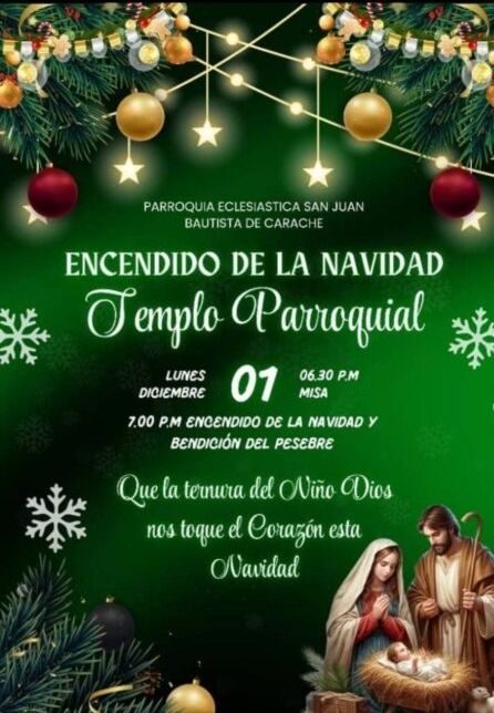 La Parroquia San Juan Bautista extiende una cordial invitación a todos los habitantes de Carache a congregarse en este espacio que promete ser una combinación de oración, luces y cultura, uniendo a la población carachense en torno a la fe y la celebración del nacimiento de Jesús.